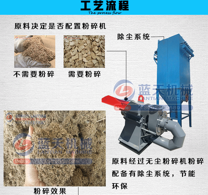 1、一般木材類原料需要根據(jù)加工需要決定是否配置粉碎機(jī),粉碎機(jī)可選用最新環(huán)保無塵粉碎機(jī),鋸末、木屑等原料則不需要配置粉碎機(jī)。