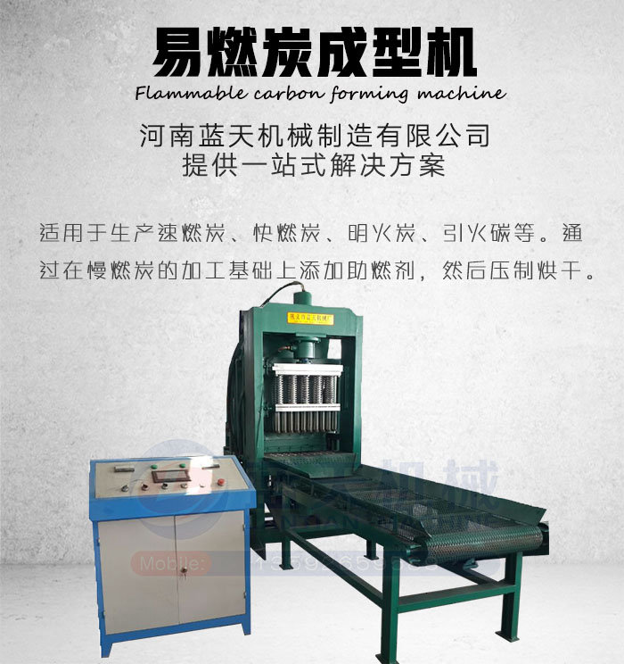 易燃碳成型機(jī)是由河南藍(lán)天機(jī)械制造有限公司運(yùn)用轉(zhuǎn)化技術(shù),將生物質(zhì)材料經(jīng)炭化粉碎后成型的成型設(shè)備。易燃炭是為方便野外燒烤使用而生產(chǎn)的一種速燃炭、引火碳、快速點(diǎn)火碳等,主要用于戶外燒烤快速引燃。易燃碳成型機(jī)可以方便的調(diào)換摸具,以便生產(chǎn)各種形狀尺寸的易燃炭,目前市場(chǎng)上常見的易燃炭分為圓柱形和蜂窩煤形。通過調(diào)換模具能生產(chǎn)出生產(chǎn)圓形、方形、梅花形、扇形、中心有孔無孔等特殊形狀。河南藍(lán)天機(jī)械制造有限公司一站式提供各種技術(shù)配方,為用戶規(guī)劃場(chǎng)地、現(xiàn)場(chǎng)指導(dǎo)、安裝調(diào)試。